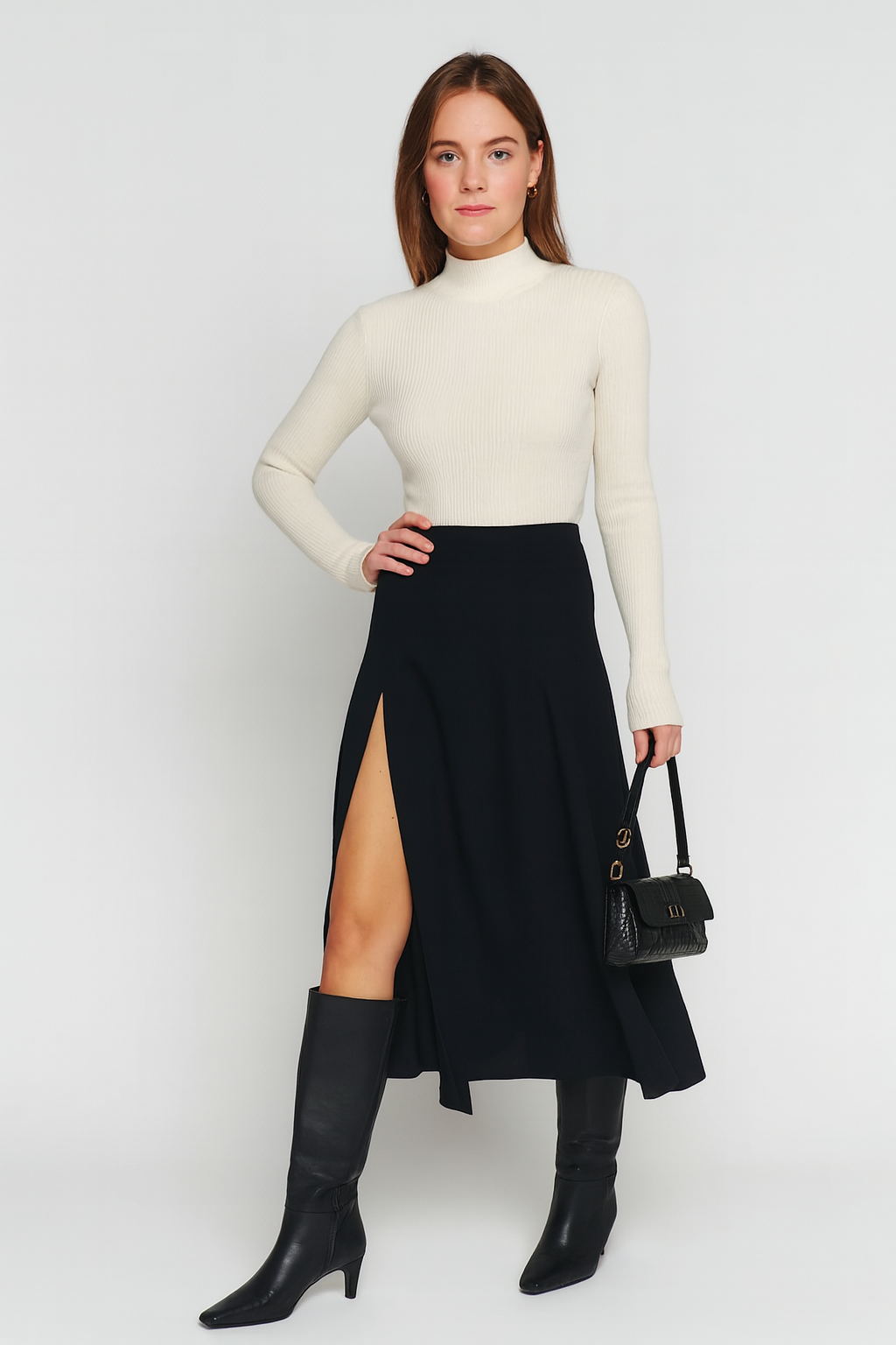 Pensée pour accompagner le mouvement naturel du corps, elle traverse les saisons avec grâce — portée avec des bottes hautes, des escarpins fins, ou une simple maille structurée.