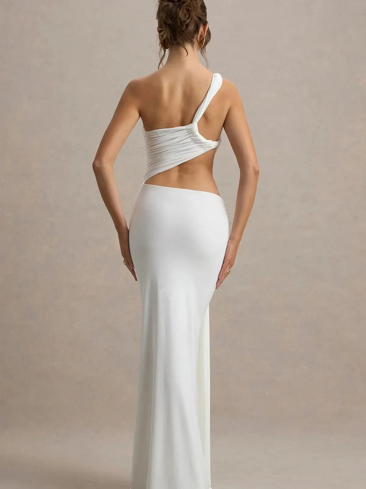 Un drapé qui épouse la silhouette, une découpe audacieuse qui sublime le mouvement — cette robe longue blanche incarne une sensualité sophistiquée, pensée pour les instants d’exception. Conçue pour élancer la silhouette tout en sculptant délicatement les courbes, elle révèle subtilement le corps grâce à son jeu de lignes obliques et de drapés maîtrisés.