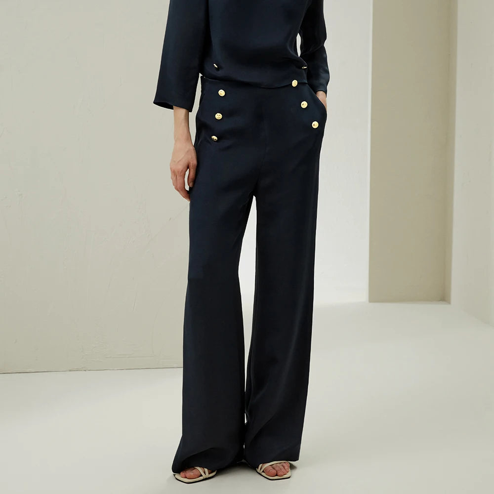 Un clin d’œil raffiné à l’élégance intemporelle. Ce pantalon palazzo fluide sublime la silhouette avec sa ligne longue et son tombé impeccable. Les boutons dorés apportent une touche de caractère subtile, inspirée du vestiaire marin revisité. Sa taille haute allonge la jambe, tandis que la fermeture latérale dissimulée préserve une allure épurée. À porter avec une blouse en soie ou un top ajusté pour une silhouette résolument chic.